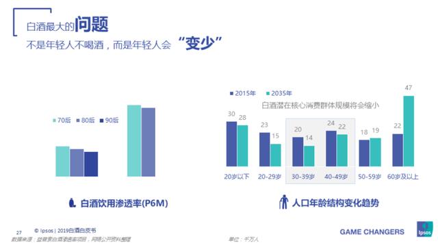 另一方面,年轻人饮酒的群众基数越来越小。据益普索发布的《2019中国白酒市场白皮书》显示,国内白酒行业发展的最大问题不是年轻人不喜欢白酒,而是年轻人会“变少”。数据显示,到了2035年,除了60岁以上的群体,其他各年龄段消费者数量都会减少,特别是20-29岁人群。90后的年轻人群特征鲜明,他们更喜欢流行的产品(51%)、低度酒(41%)、创新包装(39%)和新喝法(36%)。也就是说,帮助江小白快速崛起的年轻消费者们,对白酒的要求越来越高了。