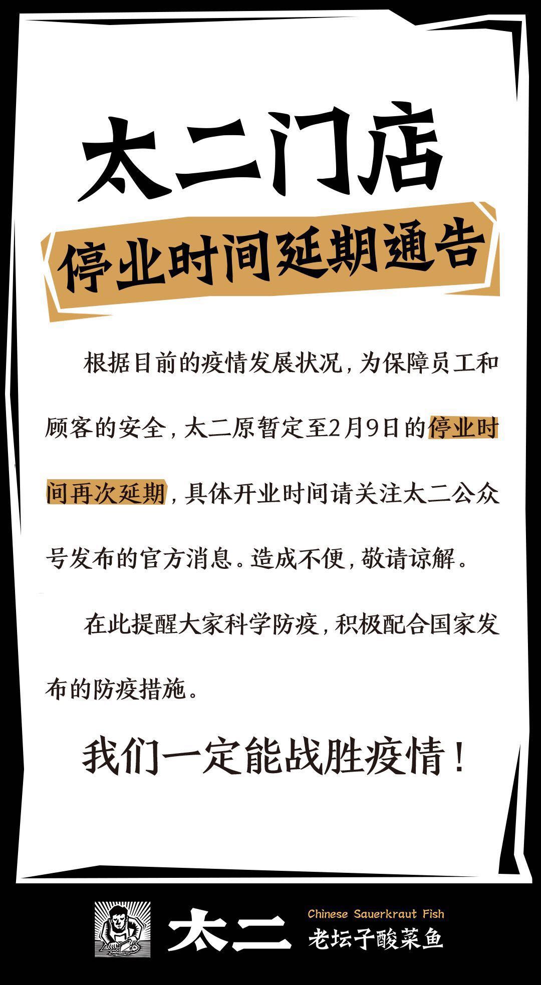 根据九毛九微信公众号,鉴于疫情的最新发展情况,为持续加强对病毒的防控工作,旗下所有门店(包括九毛九、太二酸菜鱼、那未大叔是大厨等的自营及特许经营门店)暂停营业时间将会进一步延长。