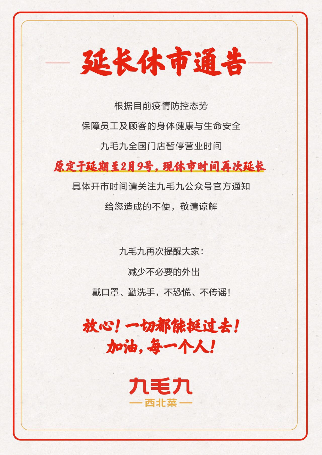 1月24日起,九毛九旗下所有品牌在武汉的门店暂停营业,1月26日起全国范围内的所有品牌门店暂停营业,原计划2月10日恢复营业。