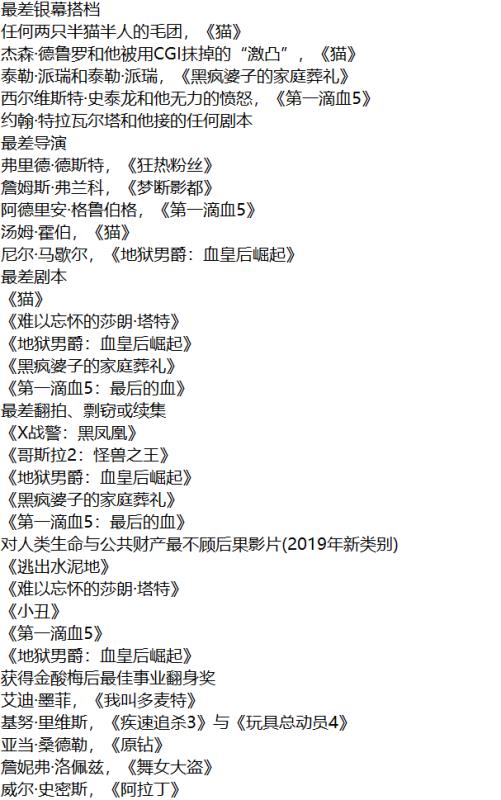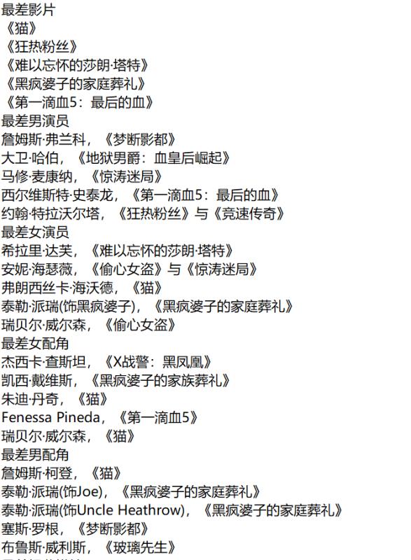 2月9日,据CNN报道,第40届好莱坞“金酸莓奖”公布提名,《猫》、《黑疯婆子的家庭葬礼》和《第一滴血5:最后的血》三部影片领跑,各获8项提名。自编自导自演并且参与《黑疯婆子》制片的泰勒·派瑞因此收获不少提名,包括最差编剧、最差女演员(派瑞为男性演员)、最差银幕组合,以及2项最差男配角的提名。