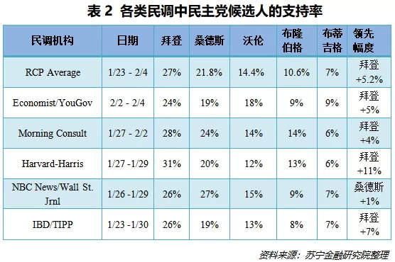 其次,初选较早的州具有广告效应。尽管遭遇了投票APP的技术故障,导致了计票结果公布时间推迟,减小了示范效应,但首战告捷将极大激发布蒂吉格的斗志。然而,面对民主党的那几位“老炮儿”,布蒂吉格能否在3月的包括“超级星期二”在内的各州集中初选获得持续成功,不确定性很大。毕竟,拜登作为奥巴马的副总统,对黑人群体有很大的吸引力;桑德斯在年轻选民中也有着不可比拟的优势。不得不说,布蒂吉格面临着非常大的竞争。从近期民调结果看(见表2),大多数人也并不看好布蒂吉格的竞选之路,其民调支持率显著低于其他候选人。