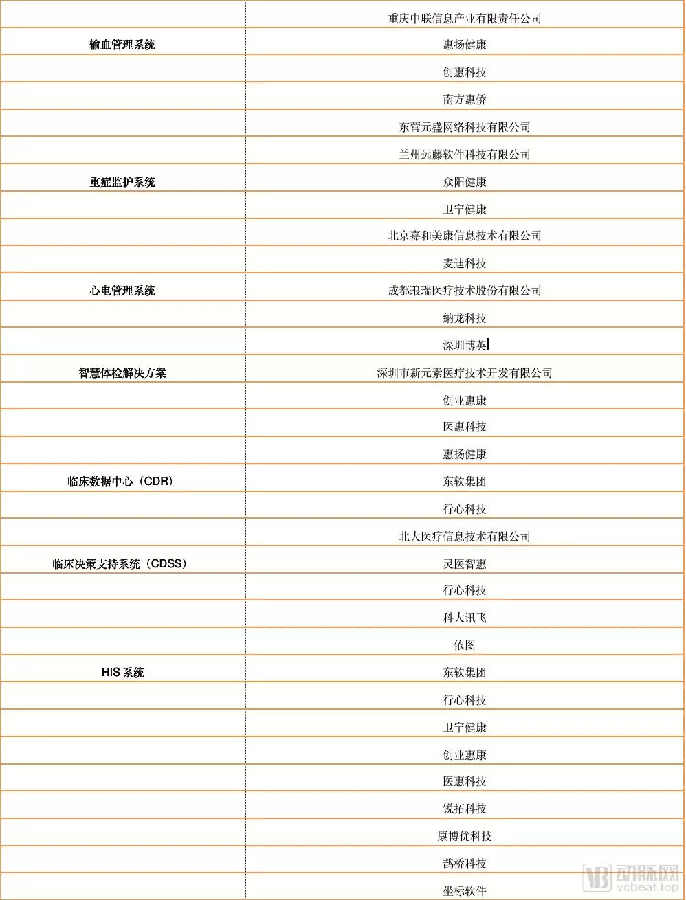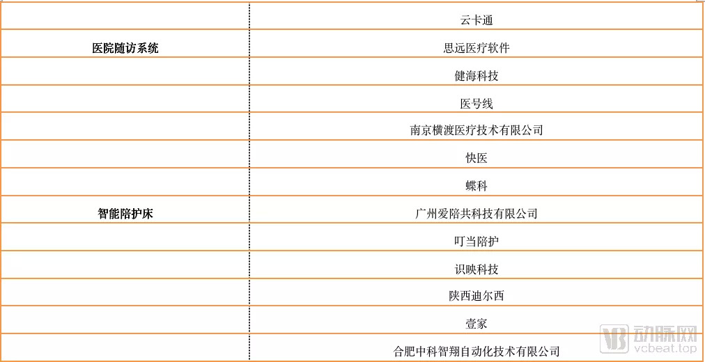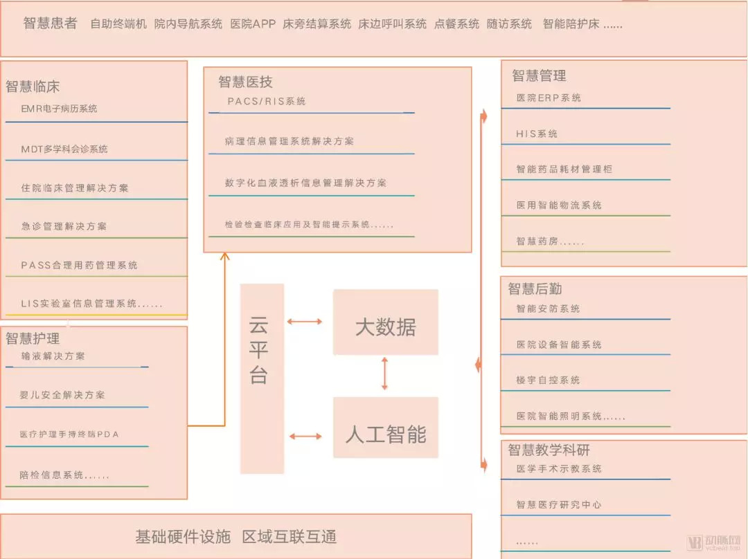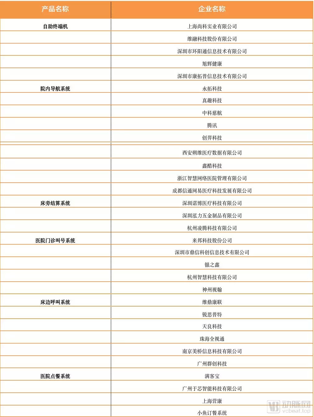 具体而言,自助终端机、院内导航系统、医院APP、床旁结算系统、医院门诊叫号系统、床边呼叫系统、医院点餐系统、医院随访系统、智能陪护床等系统均属于这一范畴。