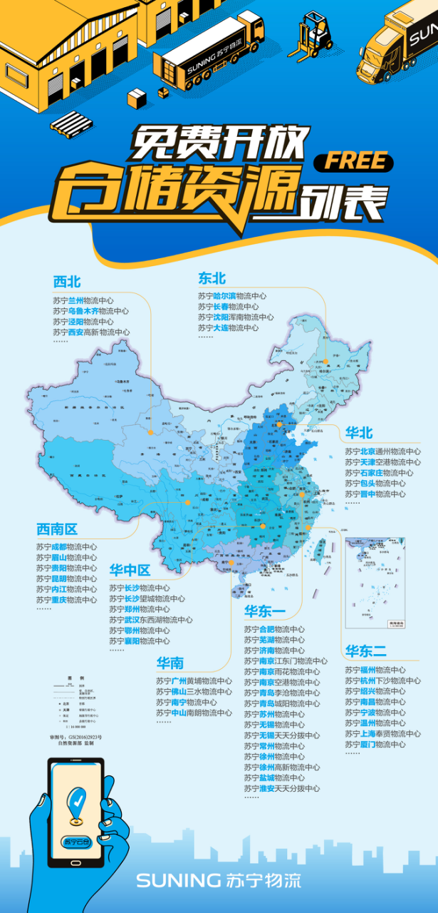本次免费仓储资源涉及苏宁物流全国100+物流中心,涵盖北京、上海、广州、南京、成都、武汉、沈阳、西安、天津、温州、长沙、中山、佛山、徐州、青岛、哈尔滨等城市。
