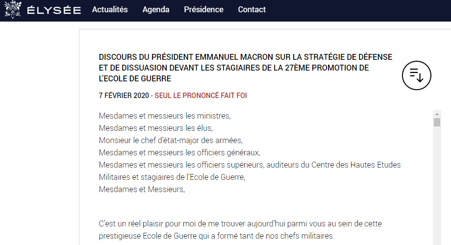 在吸取了去年11月“北约脑死亡”外交风波的教训后,法国总统马克龙在2月7日于法国军事学院(École de Guerre)发表的国防战略演讲中显得格外克制。一贯喜欢脱稿即兴发挥的他全程选择了对着演讲稿照本宣科,更是在演讲一开场就强调了“北约是欧洲安全最重要的支柱”。