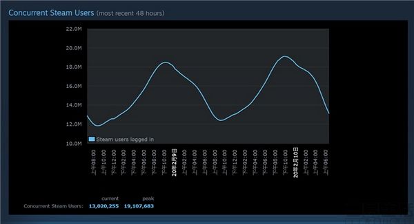 但是外界没有想到仅仅在一周之后,根据Steam官方公布的数据显示,该平台同时在线人数峰值在2月9日晚间突破1900万,而注册人数更是同样再创新高。