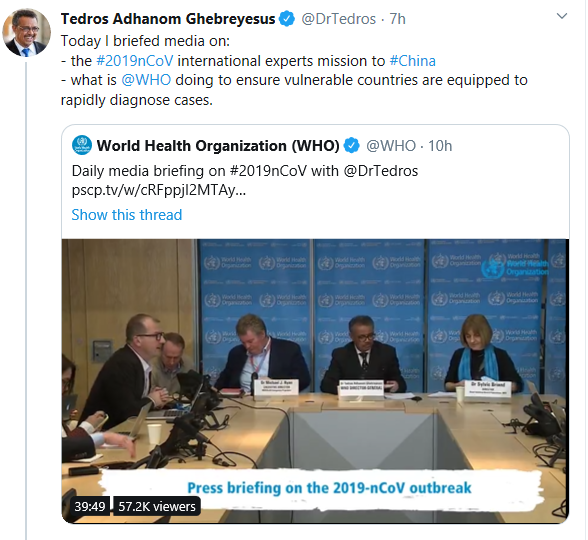 在回答央视和日本媒体的提问时,世卫组织总干事谭德塞表示,这支经验丰富的专家团队有WHO的完全授权,WHO不会干涉专家组的具体工作。他们工作的流程和在中国的工作时间将由专家组独立决定。