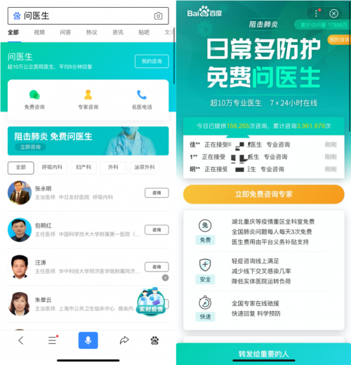 值得关注的是,为更好地助力疫情严峻地区抗疫,满足疫情时期不断上升的医疗咨询需求,百度除为武汉地区用户优先匹配专业医生外,还进一步扩大了“问医生”线上咨询的免费服务范围。目前,湖北全省以及温州、重庆、长沙、信阳、南昌、杭州、宁波、台州、南阳、驻马店等其他10个疫情严重地区的用户,均可享受7*24小时免费的全科室咨询服务,全国其他地区用户也可免费享每天3次肺炎问题咨询服务。