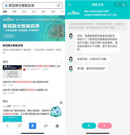 此外,为缓解民众近期的就医压力,百度更上线新冠肺炎智能自测工具,工具结合了百万份在线咨询案例,以国家卫健委最新版《新型冠状病毒感染的肺炎诊疗方案》为基,通过百度AI和大数据技术对用户目前身体状态进行智能分析,在为用户测试出“新冠肺炎”易感系数的同时,提供相应防护建议。用户现可从百度App内搜索“新冠肺炎智能自测”快捷进入测试小程序,或通过百度“抗击肺炎”专题页下的“精选栏目”找到“智能自测”入口。