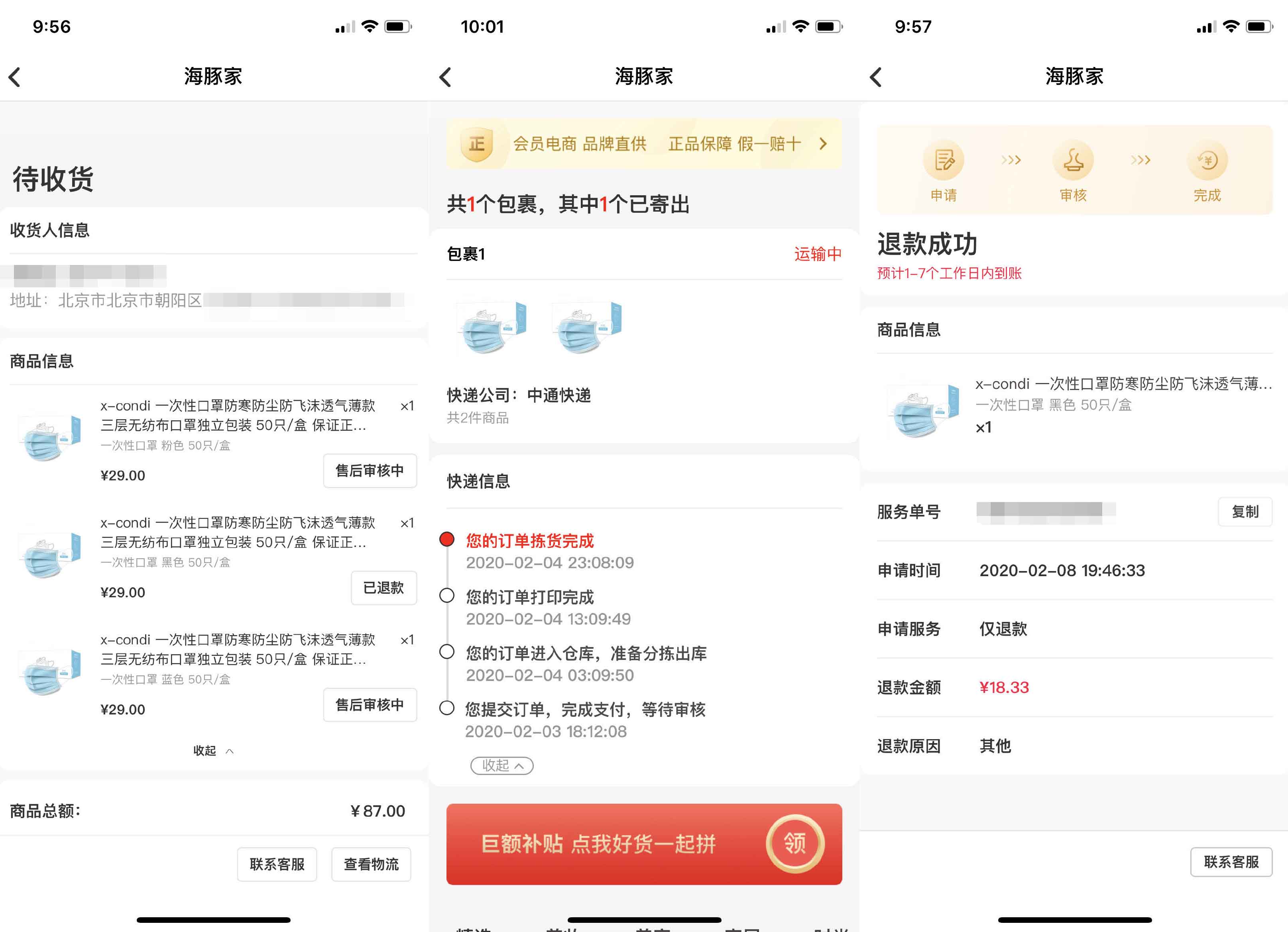 1月23日,苏小姐与朋友在拼多多平台上拼单了一款3M 9132口罩,一盒30只,售价143.5元。10天之后,据拼多多上的物流信息显示,这款商品由申通承运,2月6日从山西省发出,2月7日快件到达北京,在当天下午显示已签收,签收人显示是“朋友”。