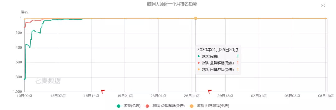 七麦数据显示,自1月16日起,《脑洞大师》便已跻身APP Store免费榜前五名。自1月26日起,便一直占据免费榜榜首位置。至今已霸榜近3周。
