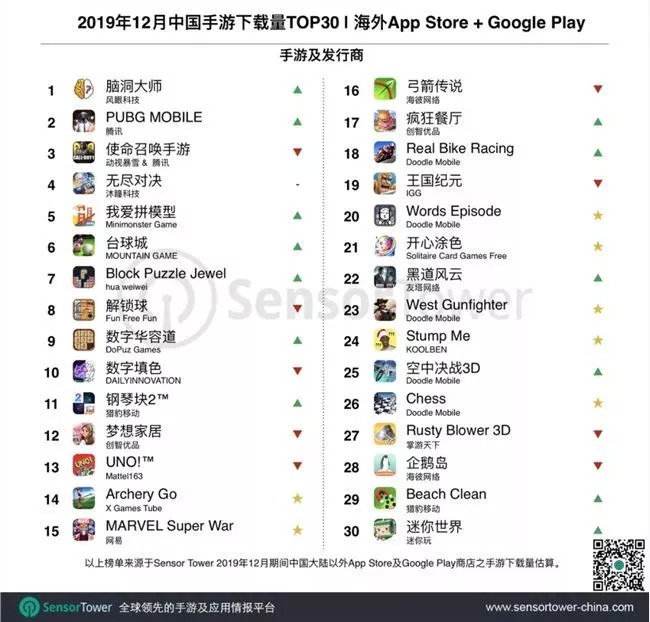 事实上,《脑洞大师》在国内霸榜之前,已经于全球市场取得了成功,这类似一款“出口转内销”的产品。根据Sensor Tower平台发布了2019年12月中国出海手游下载量Top30榜单,《脑洞大师》以4090万的下载量,力压腾讯旗下两款依托庞大IP的重度射击手游:《PUBG MOBILE》与《使命召唤手游》。打破了这两款游戏长期的榜首蝉联。