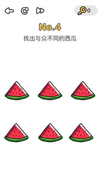 例如,在第四关中,要求玩家找出与众不同的西瓜,可界面中的六只西瓜是样子是相同的。这时,拖拽每个西瓜就可以发现,在右下角的西瓜下面隐藏了一只缺了一角的西瓜: