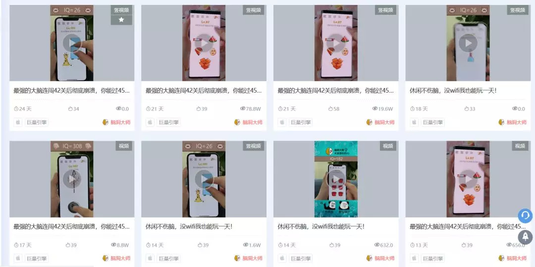 除了广泛曝光之外,短视频的形式,也十分契合《脑洞大师》这样主打休闲脑洞的游戏形式。录制完整一关的游戏时间仅需二十秒左右时间,却能让观众完整体验被“脑筋急转弯”的游戏乐趣,引起对游戏的兴趣。再以对游戏的兴趣为起点,形成后续的点击与线下转化。短视频与休闲游戏,形成了推广上的相得益彰。