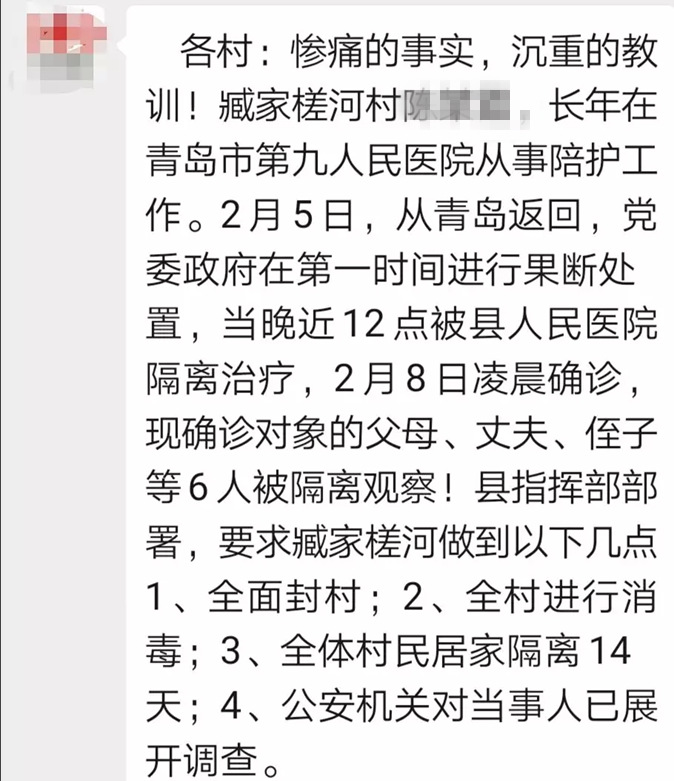 一张来自日照市五莲县户部乡乡镇联络群的微信截图显示,该确诊患者长年在青岛市第九人民医院从事陪护工作,2月5日从青岛返回,2月8日凌晨确诊,现确诊对象的父母、丈夫、侄子等6人被隔离观察。县指挥部部署,要求该村全面封存,全村进行消毒,全体村民居家隔离14天,公安机关对当事人已展开调查。