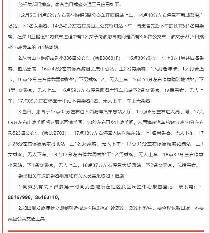 2020年2月8日晚,青岛市黄岛区委宣传部官方微信公众号发布紧急通知称,2月8日,青岛西海岸新区收到协查函:2月7日,日照市确诊一例新型冠状病毒肺炎患者,50岁女性,五莲县人,患者自述1月28日出现发热、乏力症状,现在日照市人民医院隔离治疗。2月5日,该患者由青岛市第九人民医院附近乘坐公交,经过西海岸新区返回日照市。