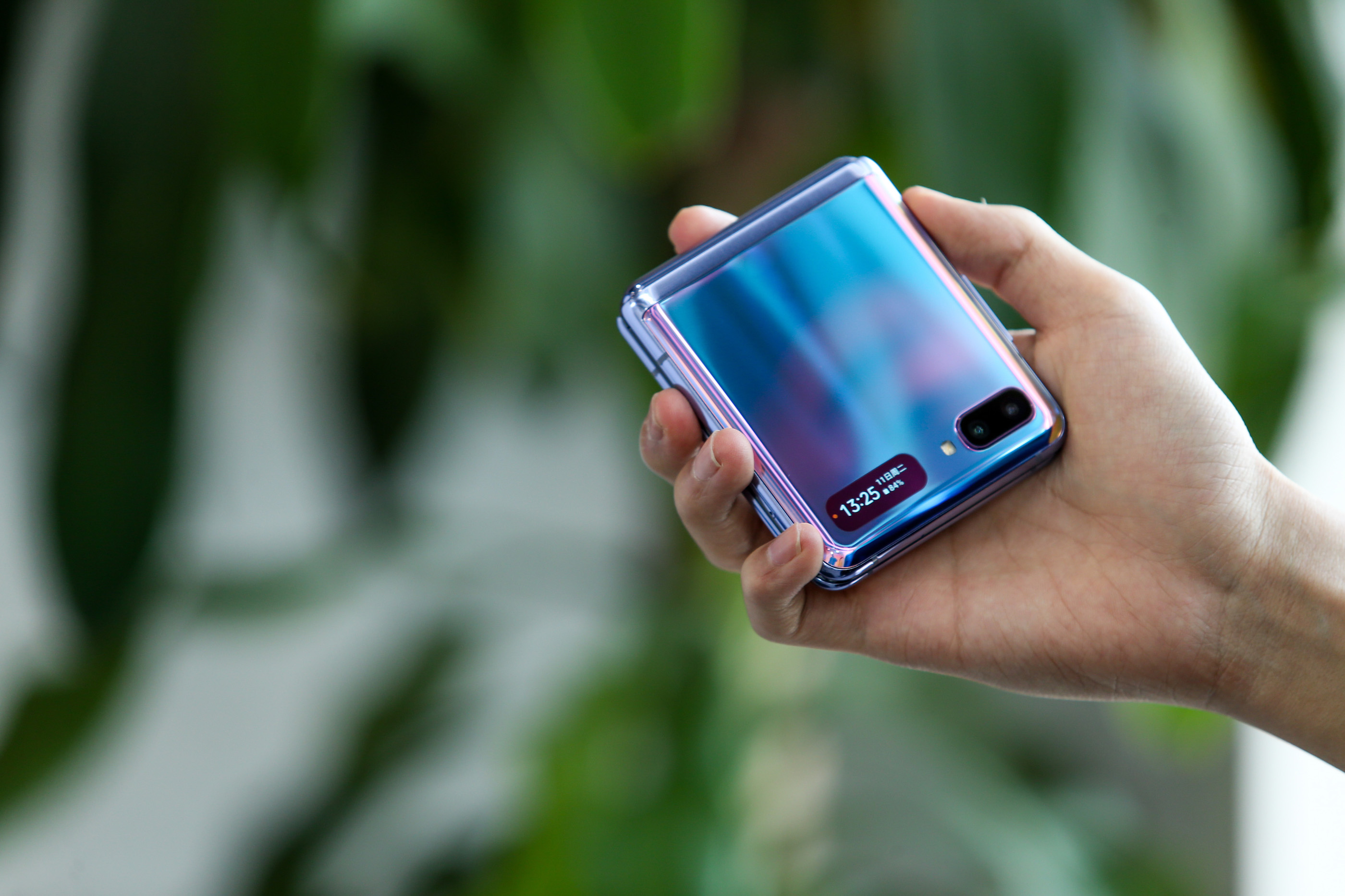 Galaxy Z Flip展开状态下就如同一台常见的智能手机,6.7英寸居中挖孔屏,Dynamic AMOLED面板分辨率2636×1080,因折叠的缘故边框比较明显,同时覆盖了一层超薄玻璃进行保护,而在上下折叠后就变得较为小巧。