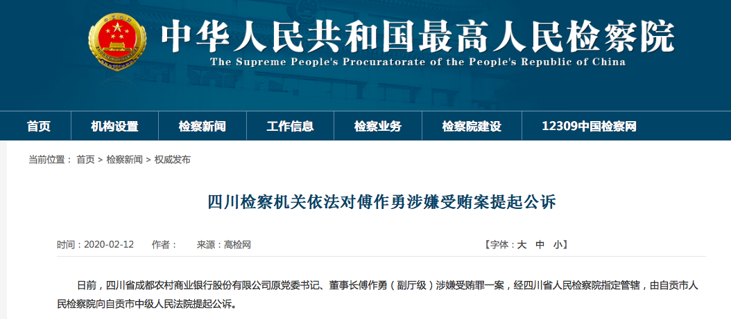 据高检网12日消息,日前,四川省成都农商银行原党委书记、董事长傅作勇(副厅级)涉嫌受贿罪一案,经四川省人民检察院指定管辖,由自贡市人民检察院向自贡市中级人民法院提起公诉。