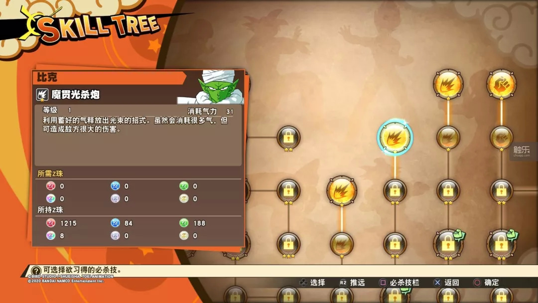 游戏中的技能树。某些技能(比如魔贯光杀炮)是剧情解锁的,某些技能需要通过完成挑战来习得