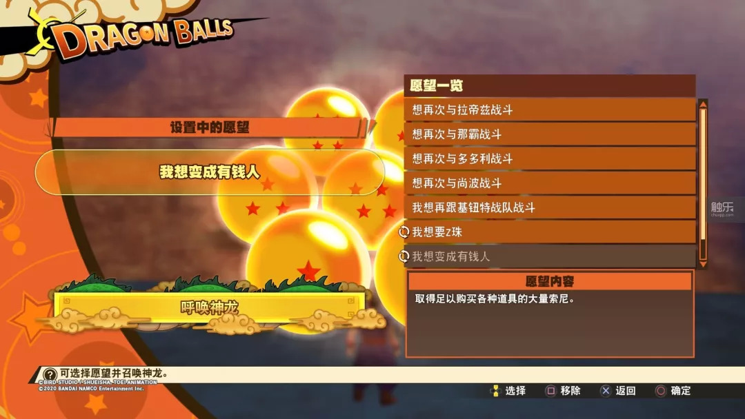 如果说据点玩法只是细枝末节,那作为“七龙珠”主题核心的“龙珠”收集玩法则真正做到了令人失望。收集龙珠和其它所有收集任务一样,只要按住鹰眼键看哪里发光,再跑过去拾取就完事了。这还不算,当玩家跑了7张地图,进行了7次重复劳动后,所能实现的愿望竟然大部分都是复活反派打一场架?好吧,我承认这很像是孙悟空的想法,但就不能再给一些更好的奖励选择吗?