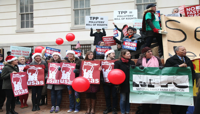 亚特兰大的抗议者们警告这项环太平洋贸易协定可能会给包括美国在内的世界各地民众带来诸多问题。这个糟糕的贸易协定是否会将美国国内的工作岗位转移至劳动力成本较低的其他国家?是否会减少美国工人的工资收入?是否会导致药品价格大幅上升?是否会将更多不安全的、受污染的食品带到美国?