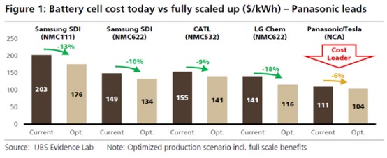 根据瑞银报告披露,松下的成本优势主要来源于正极材料。瑞银预测,只要原材料价格(尤其是钴)不出现大幅度变动,松下将在电池成本上一直保持领先。同时,新能源业内人士分析指出,日韩电池厂商更多的优势在自于工艺制造水平。几年之前日韩电池企业的动力电池制造的次品率已在百万分之一以内。也就是说,日韩电池出厂前检查良品率几乎为100%。而宁德时代在这方面还差得较远,需要部分返工,这直接导致宁德时代电芯成本要高于日韩厂商。