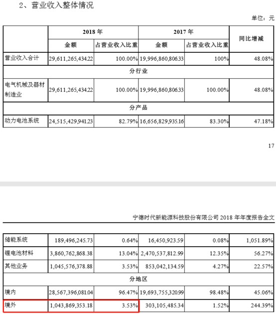 在销售区域上,宁德时代也并未体现其优于其他国际同行的产品竞争力,甚至稍逊一筹。公司2018年销售收入296.11亿,其中海外市场仅有10.44亿,占比3.53%,国内销售及其他业务占总收入的96.47%。作为一家国际领先的动力电池制造商,其产品力并未获得国际认可,含金量有所欠缺。