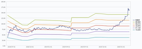 通过Wind的PE Band(市盈率通道)可以发现,宁德时代短时间内的快速上涨给其带来了巨大风险。PE Band是指由5条轨线叠加股价历史走势图构成的分析公司估值合理性的专业工具。5条轨线中,上轨是将该股在一段时期所有最高的市盈率乘以每一个时点的每股收益计算对应的股价连接而成,而下轨则是将该股在一段时期所有最低的市盈率乘以每一个时点的每股收益计算对应的股价连接而成,中间的轨道则是上轨及下轨的平均值。宁德时代长期估值中枢在31倍市盈率至56倍市盈率之间。目前80倍的市盈率已经创造了其历史最高估值记录。