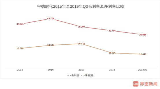 价格下滑,成本并没有同比例下降,宁德时代毛利承压。从2015年至2019年9月底,宁德时代的毛利率由最高点的43.7%下滑至2019年三季报的29.08%;净利润则由2017年的20.97%腰斩至如今的11.44%。