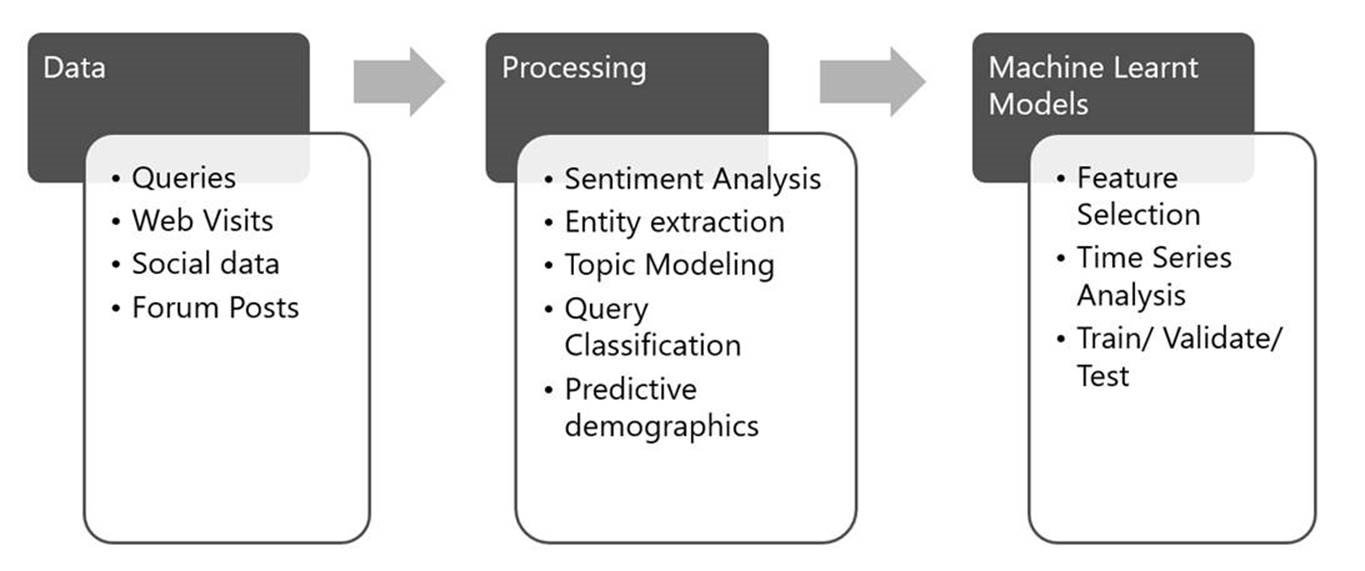 微软首席开发经理沃尔特·孙(Walter Sun)告诉科技内幕资讯网(Tech Insider)记者:“人们在网络和社交媒体上的所言所行,能够很好地反映出他们内心的想法以及接下来想要做什么。(微软随后强调,必应预测收集的所有数据都是匿名的,所有数据是作为整体集合来进行分析,因此公司不会看到与个人相关的特定搜索。)