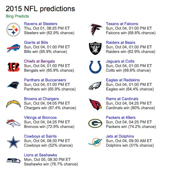 (必应成功预测NFL2015赛季的四周赛况。图片来源:必应)