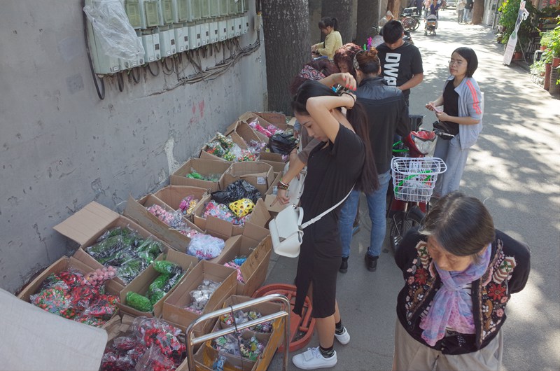 一晃到了16:00,我们换到了对面的胡同。因为在我更前面的位置还有一个三轮车摊位,数量之大草类之繁茂,全部居于我之上,这种被压制的情况是赚不到钱的,顾客没等听到我的吆喝,已经头上插满各式小草欢乐地与我擦摊而过了。