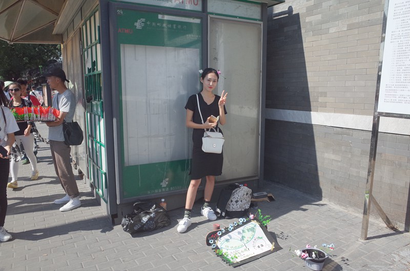 到南锣鼓巷里面去吧,滔滔人流简直是大市场。刚踏进去一米,完全走不动,只能靠着人流推行,这时候北京时间13:15,太阳好大,烤得人昏昏欲睡,金钱欲冷却百分之三十。为了不被踩踏,我们拐进了一条名叫蓑衣胡同的小胡同,选在了一个人家门口设摊,有台阶,终于可以稍歇会了。