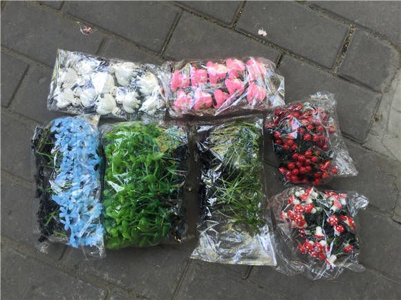 一开始我们把地点选在了南锣鼓巷地铁口的报刊亭旁边,过往行人一眼就能看到我的商业帝国,只要他们没有被汹涌的人流遮住视线。很快摆好了那些花花草草,为了吸引顾客我自己也应景地戴了俩镇摊之宝。