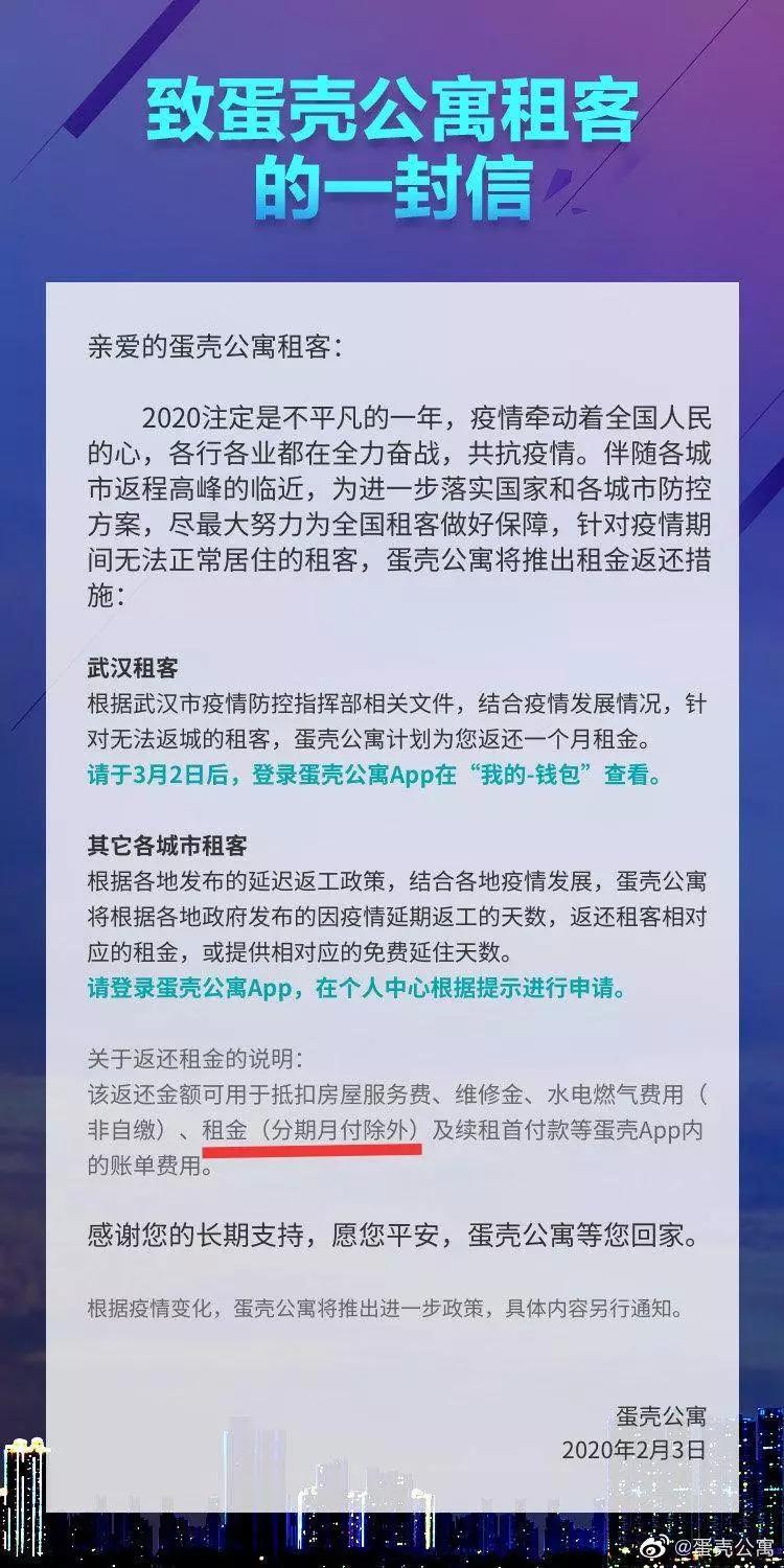 其后,蛋壳回应,将为武汉城市租客返还一个月租金(3月2日后),针对其他城市租客,将根据当地延迟返工政策,提供相应天数的租金返还或免费延住天数。