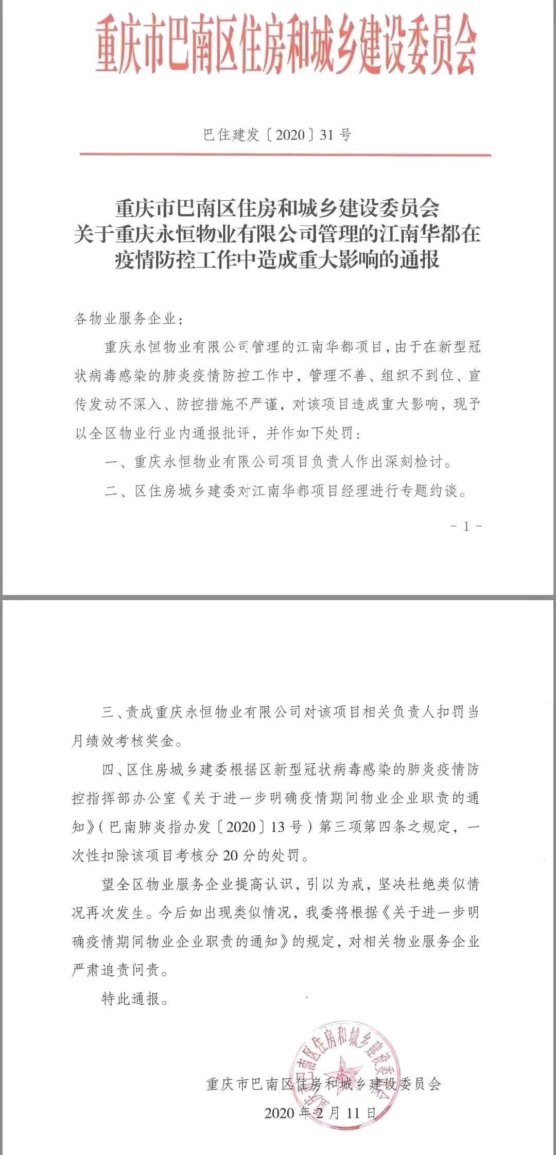 2月11日,江南华都项目物业重庆永恒物业有限公司管理,因在新型冠状病毒感染的肺炎疫情防控工作中,管理不善、组织不到位、宣传发动不深入、防控措施不严谨,而被巴南区住房和城乡建设委员会的通报批评及处罚。