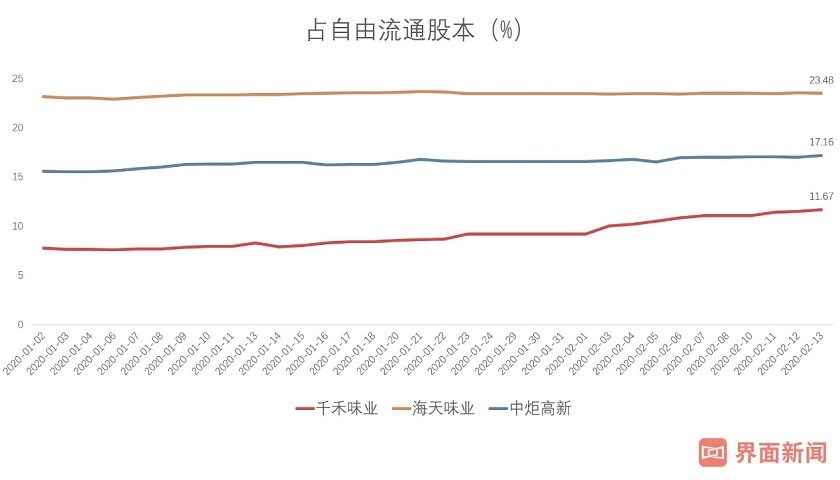2月开盘至今,海天味业(603288.SH)、中炬高新(600872.SH)和千禾味业(603027.SH)的涨幅分别为-0.37%,2.19%和6.26%。市场的反应大抵因为“酱油是必需消费品,受疫情影响不大”。