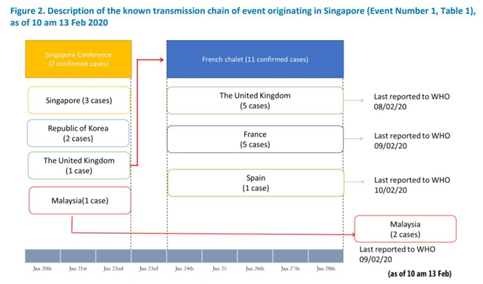 目前最广为人知的传染案例要数参会的英国员工沃尔什(Steve Walsh)。沃尔什离开新加坡后前往了法国滑雪胜地,后从日内瓦乘飞机返回英国。返回英国后在当地社区参加了瑜伽课,还去了一家酒吧。