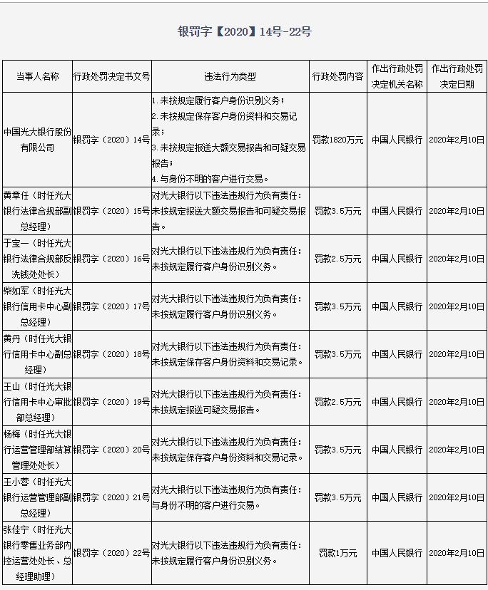 具体来看,中国光大银行股份有限公司因未按规定履行客户身份识别义务、未按规定保存客户身份资料和交易记录、未按规定报送大额交易报告和可疑交易报告、与身份不明的客户进行交易等行为,被罚1820万元。