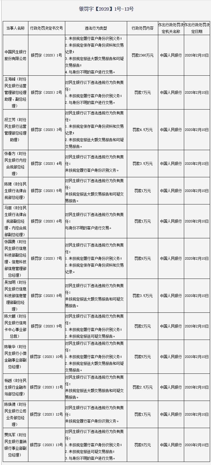 央行决定对中国民生银行股份有限公司罚款2360万元,12名负责人共处罚款45万元。其中包括时任运营管理部总经理助理、副总经理、内控合规部总经理、信息科技部副总经理、信用卡中心事业部总裁、小微金融事业部副总经理和公司业务部总经理等职务人员。
