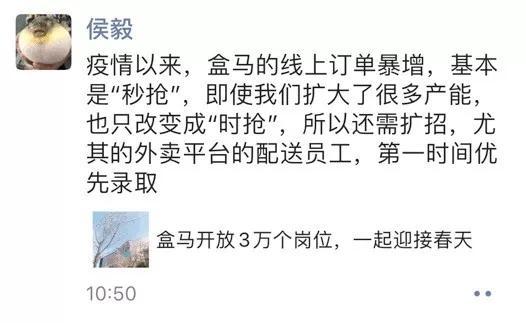 盒马创始人兼CEO侯毅也在社交媒体公开表示,“尤其外卖平台配送人员,第一时间优先录取。”