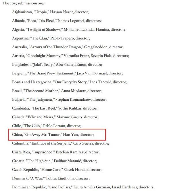 今日奥斯卡官方网站上公布了第88届奥斯卡金像奖最佳外语片全球各地区的选送片单,令人意外的是,原本代表内地冲奥的作品竟然变成了《滚蛋吧!肿瘤君》,而不是此前公布的《狼图腾》。