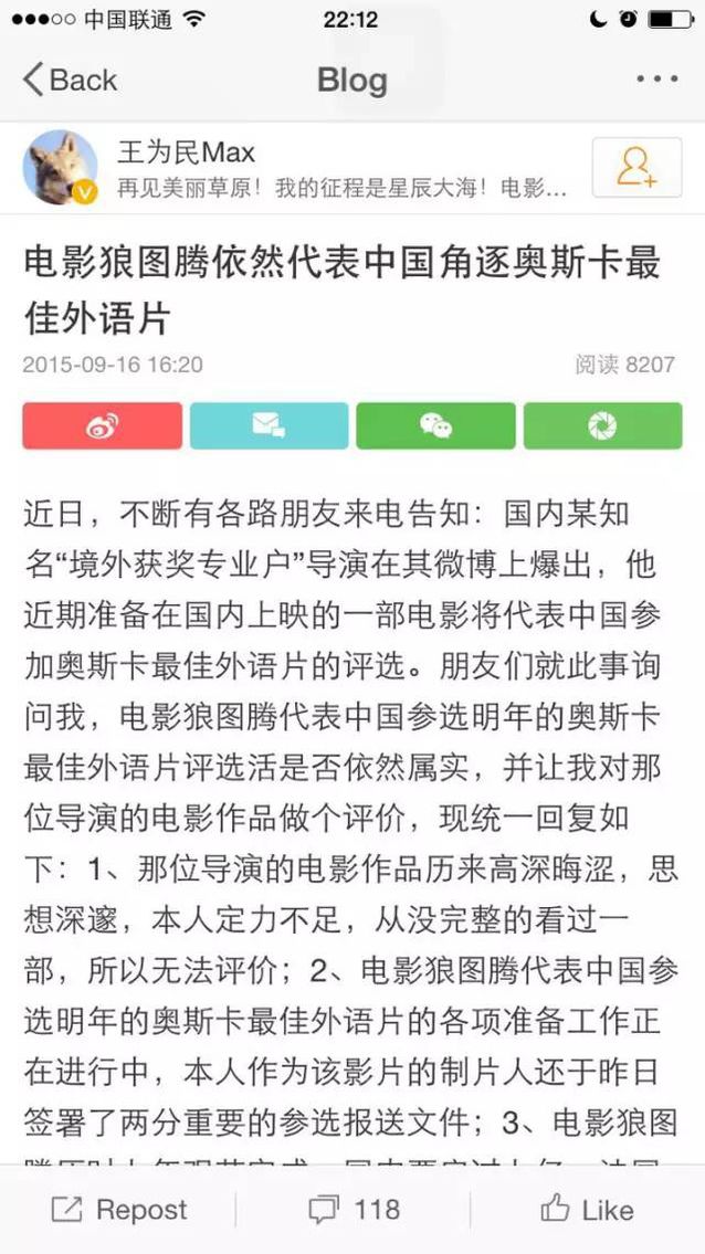 然而几天过后,《狼图腾》制片人王为民发布一条长微博确定该片代表内地出战奥斯卡最佳外语片的角逐,言语当中似乎有意针对《山河故人》以及贾樟柯,详文如下: