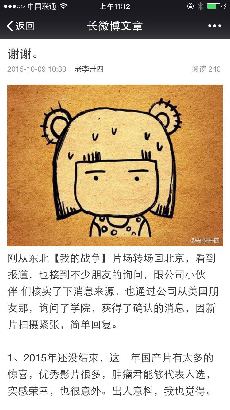 不过,作为《滚蛋吧!肿瘤君》的出品方,果实影业李亮文在自己个人微博上表达了意外和感谢: