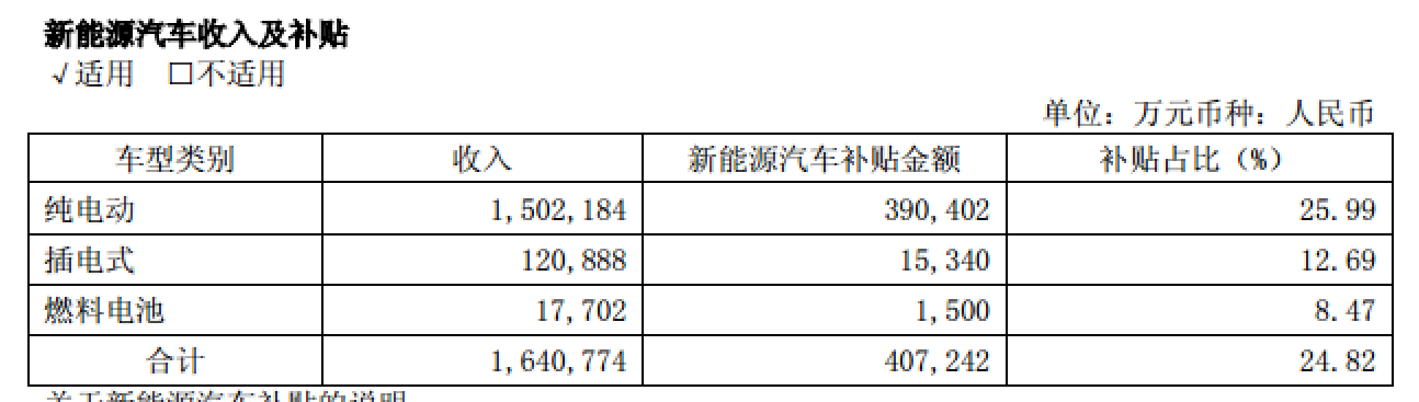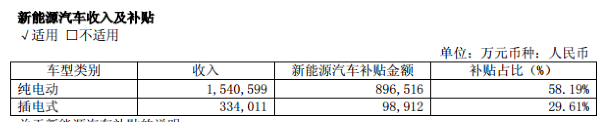 这对宇通客车来说,影响也是明显的。2016年数据显示,宇通客车纯电动新能源汽车补贴金额89.65亿元,占收入比例58.19%,插电式新能源汽车补贴金额9.89亿元,占收入比例29.61%,合计补贴了99.54亿元。