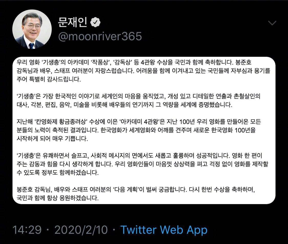 《寄生虫》获奖背后,是奉俊昊的多年努力和韩国电影行业的整体发展。作为《杀人回忆》《母亲》《雪国列车》等片的导演,奉俊昊常将类型片、强情节和社会话题结合在一起,关注底层的无助与反抗,悬置价值判断。公众号“虹膜”指出,奖项不仅属于奉俊昊一个人,它也属于所有勇于变革的韩国电影人,更属于自由表达,属于完整的艺术。奥斯卡颁奖典礼结束之后,韩国总统文在寅在SNS和官方Twitter发文:“《寄生虫》的奥斯卡四冠是过去一百年里所有韩国电影人不断努力的结果,今后政府将进一步为电影人提供能够发挥想象力,大胆创作电影的环境。”