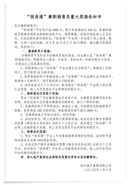 目前,其线上平台“恒房通”已成为兼职销售员最多、成交量最大的房地产销售平台,未来甚至可以销售其他房企的楼盘及汽车等大宗商品的超级交易平台。