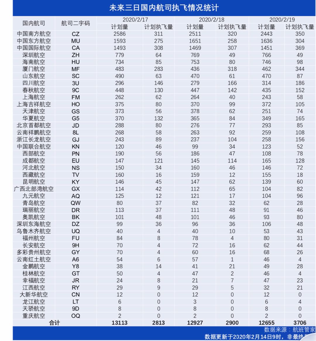 未来三日,国内航空公司中,计划执飞航班量最多四家航空公司是南航、东航、国航和厦航。但日计划执飞量均不足400架次。