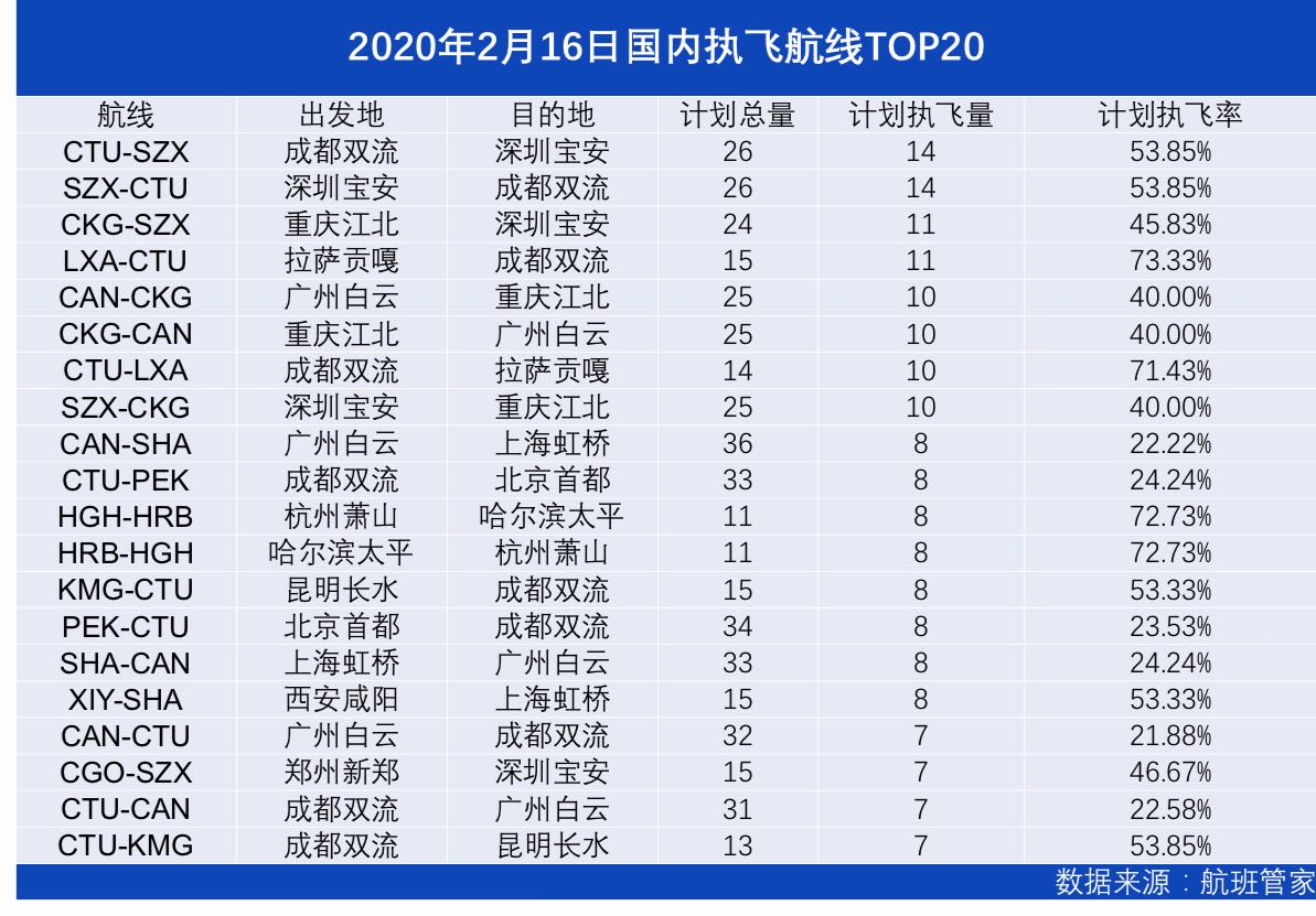 从目的地看,成都和重庆机场成为进出港航班量最多的目的地。据航班管家统计,2月16日,国内执飞航班量最多的航线是成都双流—深圳宝安、重庆江北—深圳宝安及拉萨贡嘎—成都双流。