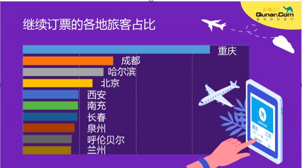 去哪儿网的统计数据也显示,目前重庆和成都的旅客继续购票。同时一些二线城市,南充、泉州、长春等也位于继续购票城市的Top10。重庆、成都、哈尔滨等城市是近年春运期间的热门目的地城市。数据反映出,来自这些人口输出城市的刚需旅客选用快捷的航空交通出行。