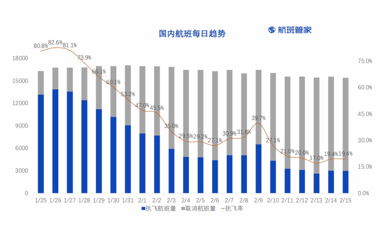 据航班管家,目前国内航班每日执飞量仍在较低位,航班取消率超过80%。而北京首都—上海虹桥、上海虹桥—深圳宝安等热门往返航线在2月9日(正月十六)迎来一波小高峰后,航班量继续走低。